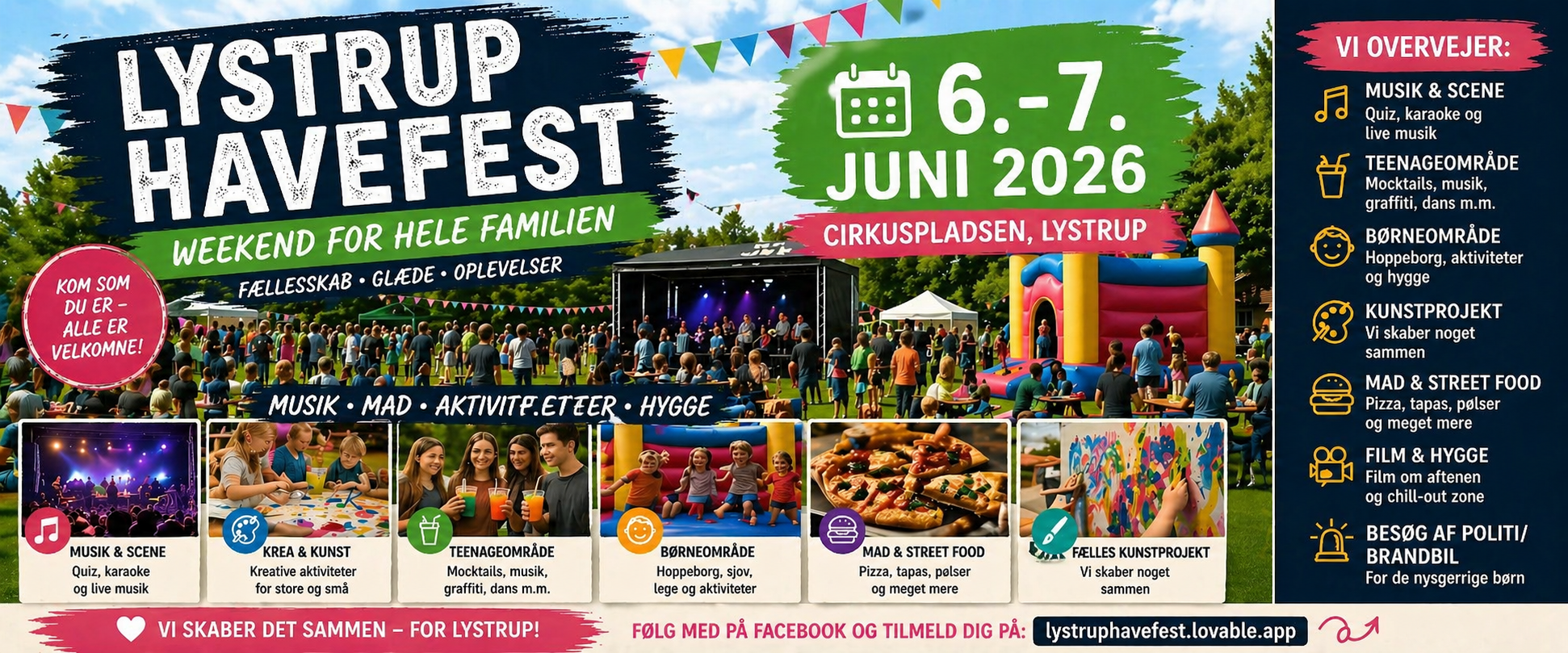 Lystrup er en by med mange familier, men få fælles arrangementer. Lystrup Havefest bliver et sted, hvor vi mødes og oplever noget sammen — 6.–7. juni 2026.